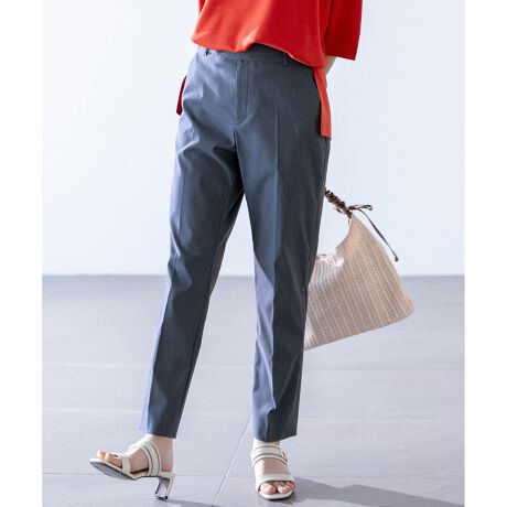 ・快適なストレッチ性とほどよくラフな生地感でデイリーに穿きやすく、綺麗めからカジュアルまで幅広いシーンにマッチ・ほどよい股上の深さで自然にスタイルアップし、足がほっそり見える美脚シルエット・ベルト無しでも決まりやすいボタンデザイン・センタープレスデザインが綺麗めスタイルにもマッチするのでオフィスカジュアルにもおすすめ
