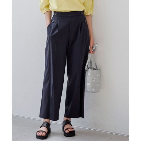 ・快適なストレッチ性とほどよくラフな生地感でデイリーに穿きやすく、綺麗めからカジュアルまで幅広いシーンにマッチ・ほどよい股上の深さで自然にスタイルアップし、足がすらっと長く見える美脚ワイドストレートシルエット・マリンパンツ風のボタンデザインがシンプルなスタイリングでも着映えするポイントに・センタープレスデザインが綺麗めスタイルにもマッチするのでオフィスカジュアルにもおすすめ・トップスアウトのスタイリングも綺麗にきまる、高めのボタン配置デザイン