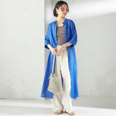 フロント開きのバンドカラーで顔周りがすっきりと見え、抜け感のある着こなしが叶います。
