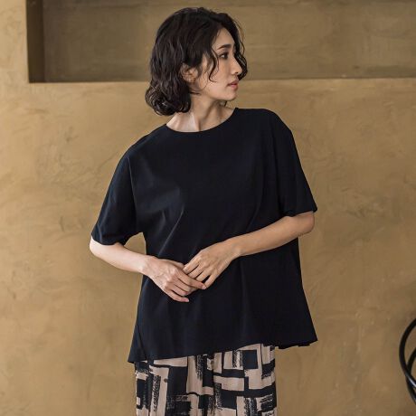 シンプルながら、シルエットの変化を持たせることで羽織りインでも着まわしやすく、万能な一枚。