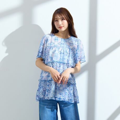 エアリーで軽やかな素材で仕上げたおとな可愛いシフォン楊柳のティアードブラウス。