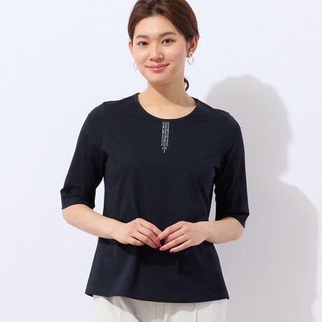 【洗える・日本製・S〜LLサイズ】襟ぐり刺繍 綿レーヨンTシャツ