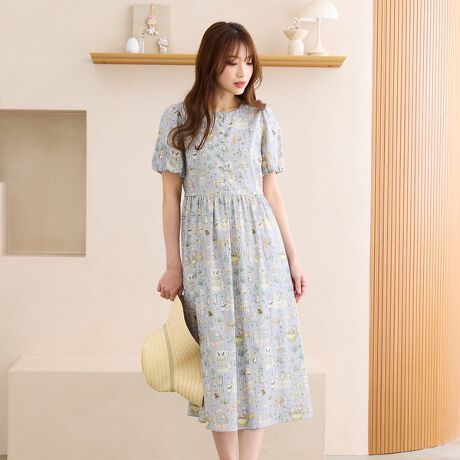 綿麻の天然素材がナチュラルな印象で愛らしいプリント柄を贅沢に使用したフィット&フレアの個性的なワンピースはまさにここにしかないかわいさ。