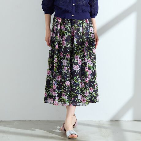 シアーなシャドーチェックが夏らしい清涼感と陰影感を醸し出すローズプリントが愛らしいフレアスカート。