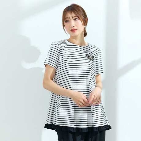 カジュアルなボーダー柄も細いラインなのですっきりと見え、裾の切替フリルがキュートなアクセントになったデザイン。