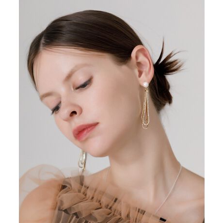 上品なパールと、繊細にきらめくビジューをあしらったゴールドチェーンが揺れる、存在感抜群のロングピアス。