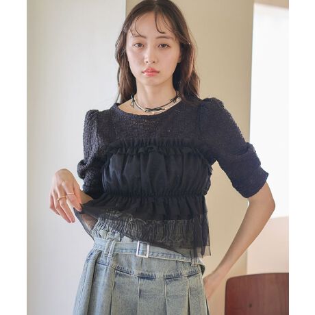 トレンドのレイヤードスタイルが楽しめるセットアイテム。フェミニンなチュールビスチェはギャザーをたっぷりと施し立体感のあるデザインに仕上げました。ポコポコとしたフラワー柄が目を惹くプルオーバーは伸縮性があり、着心地も抜群。セットでの着用はもちろん、それぞれ単品でも使える着回し力の高さも魅力です。