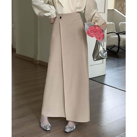 フロントの切り替えラインとウエストのボタンディテールが、さりげないアクセントに。きれいめブラウスやニットとも好相性で、オフィスシーンから休日のお出かけまで幅広く活躍。