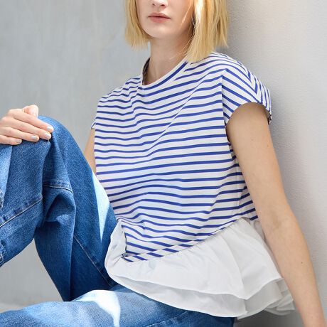 天竺カットソーの裾に立体感のあるティアードフリルをドッキングしたデザインプルオーバー。