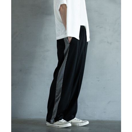 ジャガード柄の別生地がサイドラインをきわ出させオシャレ感を演出してくれるワイドトラックパンツ。