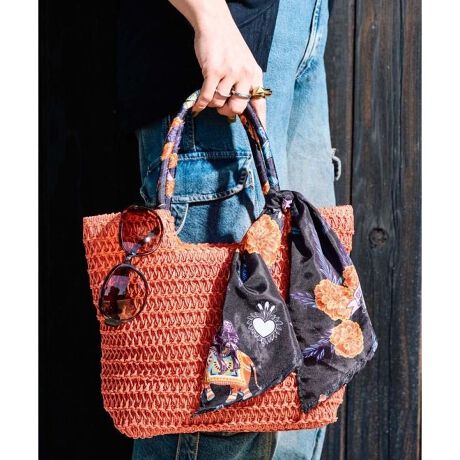 旅するカラベラ柄のスカーフがアクセントのペーパーミニバッグ。しっかりとした裏地と内ポケット付き。開口部はファスナー式なので中身がこぼれる心配がなく、様々なシーンで大活躍間違いなしです。