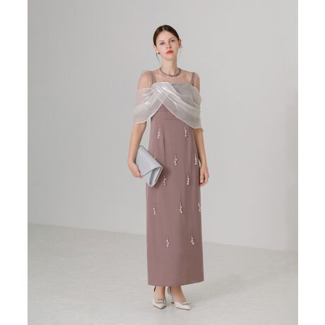 シアービスチェは取り外し可能な2WAYデザイン。ワンピースだけでもシアーとビーズが映えるモードなドレススタイルに。