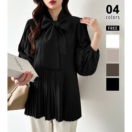 ボウタイブラウス リボン ブラウス オフィスカジュアル フォーマル 長袖 プリーツ ペプラム