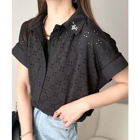 アイレットレースがフェミニンなフレンチスリーブシャツ。