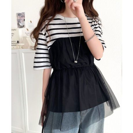 綿100%Tシャツとチュール素材をビスチェレイヤード風に異素材ドッキング。