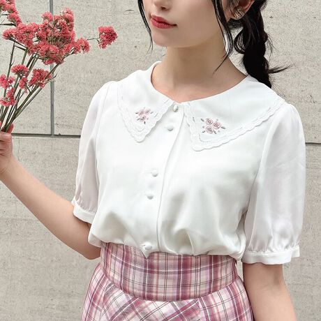 衿のローズ刺繍がとびきりキュートなブラウス。