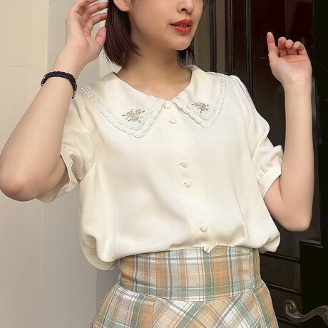 衿のローズ刺繍がとびきりキュートなブラウス。