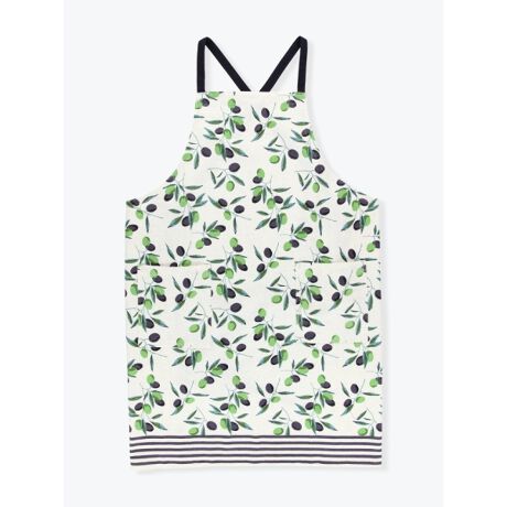オリーブ柄と裾にボーダーラインが描かれたショートエプロン。