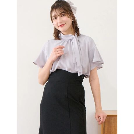 上品な艶のあるパール付きスカーフタイがエレガントなムードを演出するブラウス