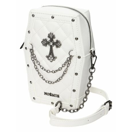 クロスモチーフが施された棺桶型ショルダーバッグ。