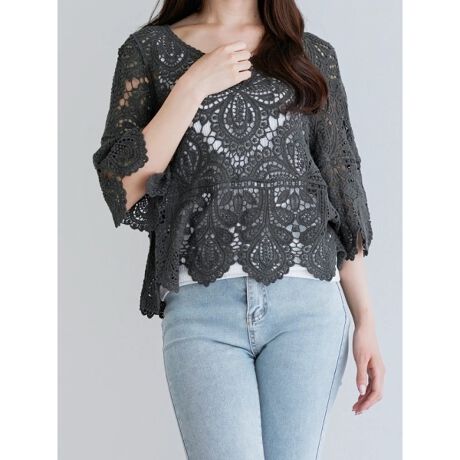 花柄のクロシェ編みのデザインが華やかなムードを演出するトップス。