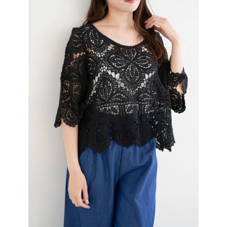 花柄のクロシェ編みのデザインが華やかなムードを演出するトップス。