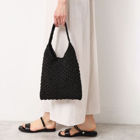 今季トレンドのメタリックカラーを使用した手編みのバッグ。