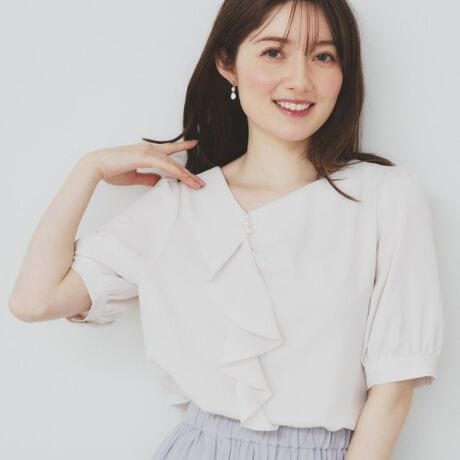 アシメフリルにパール調釦が華やかで上品な印象のブラウス