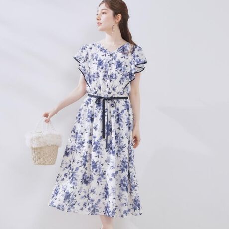 配色パイピングのラッフル袖とダブル釦のアクセントが効いた、水彩タッチのブーケ柄ワンピース
