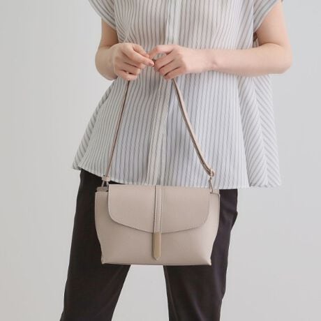 ベルト先のメタルパーツに存在感がある上品なフラップ付きショルダーバッグ。