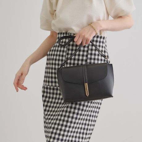 ベルト先のメタルパーツに存在感がある上品なフラップ付きショルダーバッグ。
