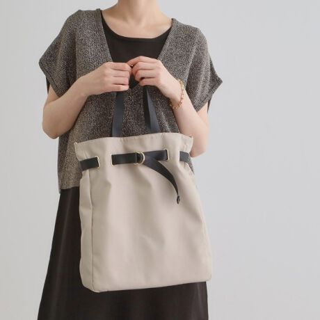しっかりした撥水加工素材を使用したフロントのベルトデザインがトレンドのトートバッグです。