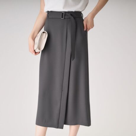 バックル付きの共地のリボンベルトがウエストを美しく引き締め、全体のバランスを整えます。
