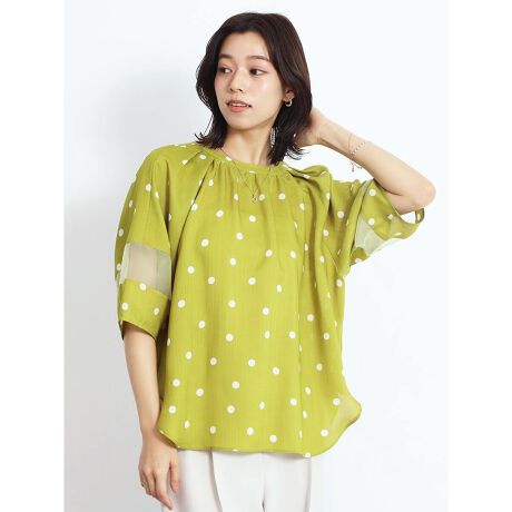 袖の一部にシアーデザインを施したドット柄ブラウス。