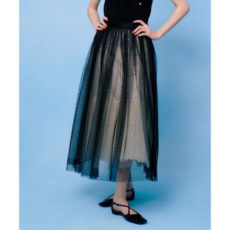 表地はチュール×黒ドットでスタンダードですが、下のチュールに色があるだけでドットが際立つマルチSKに。白チュールに黒ドットには下に黒チュールを重ねており、かわいさの中にモードさを感じさせる配色になっています。