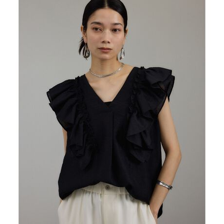 贅沢なダブルフリルがポイントのノースリーブブラウスです。