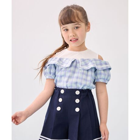 キッズ/半袖/チェック/オフショルダー/ブラウス/ドッキング/おでかけ/通園/通学/人気/デイリー/女の子/ガール/サスティナブル