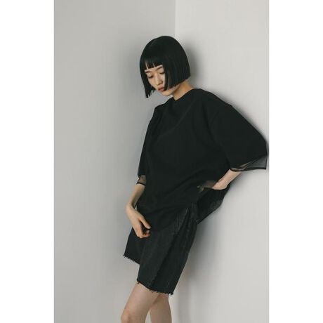 WHT:モデル身長165cm(FREEサイズ着用)BLK,BEG:モデル身長166cm(FREEサイズ着用)柔らかなタッチのダンボール素材と繊細なチュール生地をレイヤードしたルーズT。ダンボール素材は程よいハリ感があり、シワになりにくく扱いやすいのもポイント。ゆったりとしたボクシーシルエットでリラックスした抜け感のある一枚です。透け感なし(チュールあり)、ストレッチあり。【お手入れ方法】マシンウォッシュ可