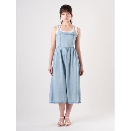 Aラインのデニムドレス。コルセット風のデザインが特徴です。春先に合わせやすいライトインディゴカラー足元はヒールなどの大人な合わせ方は勿論、スニーカーなどとカジュアルな合わせ方もお勧めのアイテムです。