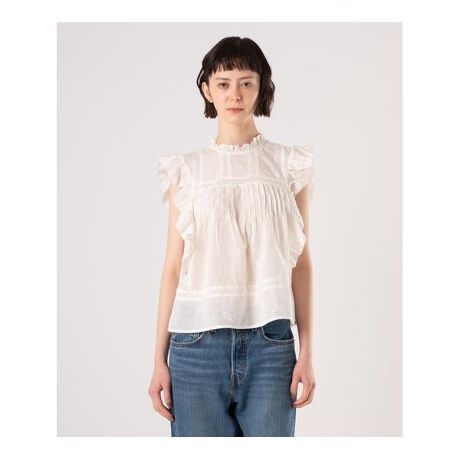 ふんわりとしたシルエットのホワイトカラーのブラウス。フラッタースリーブと高いネックラインが女性らしさをプラスしてくれます。綿にレーヨンを配合しており、ハリがありながらもドレープ感のある生地感で着心地も良好です。春先のスタリングのアクセントに重宝する一着です。