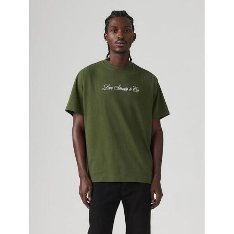 ゆったりとしたリラックスシルエットのTシャツ。グリーンカラーのボディにリーバイスロゴがプリントされたデザインです。流行りのリンスカラーのジーンズやワークパンツと合わせていただきたい一枚です。