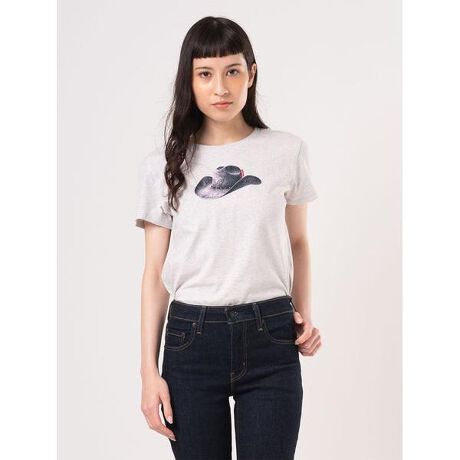 クラシックなクルーネックでスタンダードのTシャツ。グレーカラーのボディのフロントにカウボーイハットのグラフィックを施したデザインです。春先には羽織もののインナーとして、夏にはスタイリングの主役として活躍する一枚です。