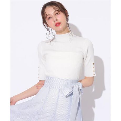【着用シーンを選ばず着回ししやすい万能ニットプルオーバー★】【Point】・滑らかでソフトな肌触りが着心地の良い五分袖ニットプルオーバー。・袖口の金ボタンが上品な印象をプラスします。・夏でも着やすいプチハイネック。単品使いはもちろん、キャミワンピ―スなどのインナーとしても活躍する着回しのしやすさ◎・身体のラインをすっきりと見せつつ、肉感を拾いにくい程よい硬さのあるリブの編み地。気になる二の腕も自然にカバーしてくれるので、オフィスでも着られる安心感のある一着です。ケア方法:手洗い可能透け感:なし裏地:なし伸縮性:あり光沢感:なし生地の厚さ:中肉