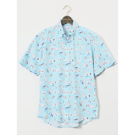 着映え度抜群、コーディネートの主役になるボタンダウンの半袖シャツです。海のモチーフを切手にした夏らしい総柄プリントがポイント。左胸ポケット付きで利便性にも優れています。