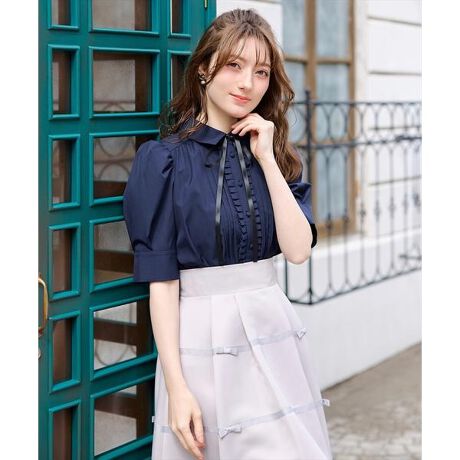 五分袖ピンタックプリーツ配色ナローリボンブラウス