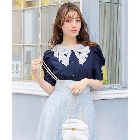 【繊細なエンブロイダリーレースが、存在感のあるビッグカラーでドラマティックな着こなしに仕立てるパールボタンブラウス】【Point】・王道クラシカルに着映えるホワイトカラーブラウス。・大きめのエンブロイダリーレースがドラマティックな着こなしに仕立ててくれます。・フロントと袖口のパールボタンがアクセントに。女性らしく上品な印象をプラスします。ケア方法:〈オフ・ラベンダー〉手洗い可能〈ネイビー〉ドライクリーニング透け感:なし(オフのみ多少あり)裏地:なし伸縮性:なし光沢感:なし生地の厚さ:中肉