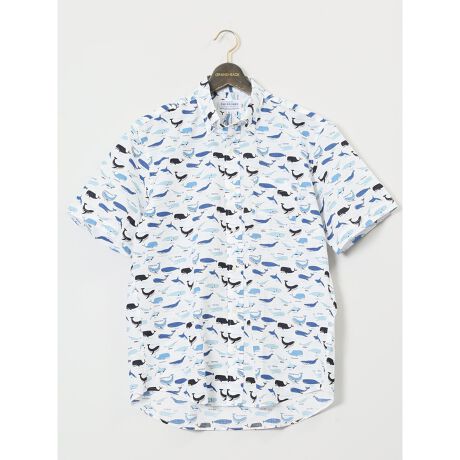 着映え度抜群、コーディネートの主役になるボタンダウンの半袖シャツです。クジラをモチーフにした夏らしい総柄プリントがポイント。左胸ポケット付きで利便性にも優れています。