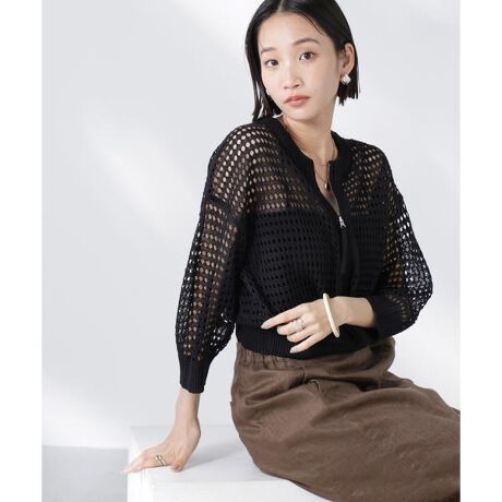 着るだけでトレンド見えするメッシュ柄のニットブルゾン。羽織としてもジップを閉めてプルーバーとしても着回せる万能デザイン。ショート丈の程よくゆとりのあるサイジングで、バランス良くすっきり着こなせるのも魅力的。インナーには半袖カットソーや、カップ付きのキャミソール、タンクトップ、ワンピース等を合わせても素敵です。