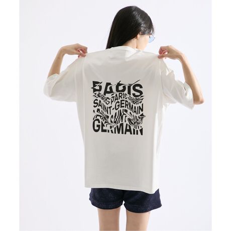 フロントは控えめなロゴプリント、バックには「PARIS SAINT-GERMAIN」の文字を様々なフォントで組み合わせた、アートのようなデザイン。