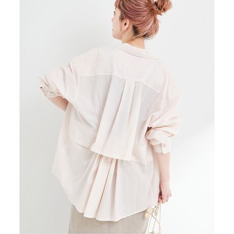 紐でギャザーを寄せたデザイン性のあるバックスタイルがポイントで、シャツとブラウスの中間のようなディティールになっています。